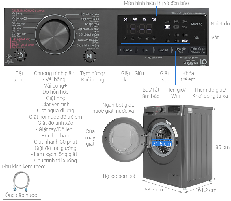 Máy giặt LG sử dụng động cơ dẫn động trực tiếp giúp cho máy giặt hoạt động êm hơn, giảm rung, giảm ồn. Ngoài ra, động cơ còn được bảo hành lên đến 10 năm