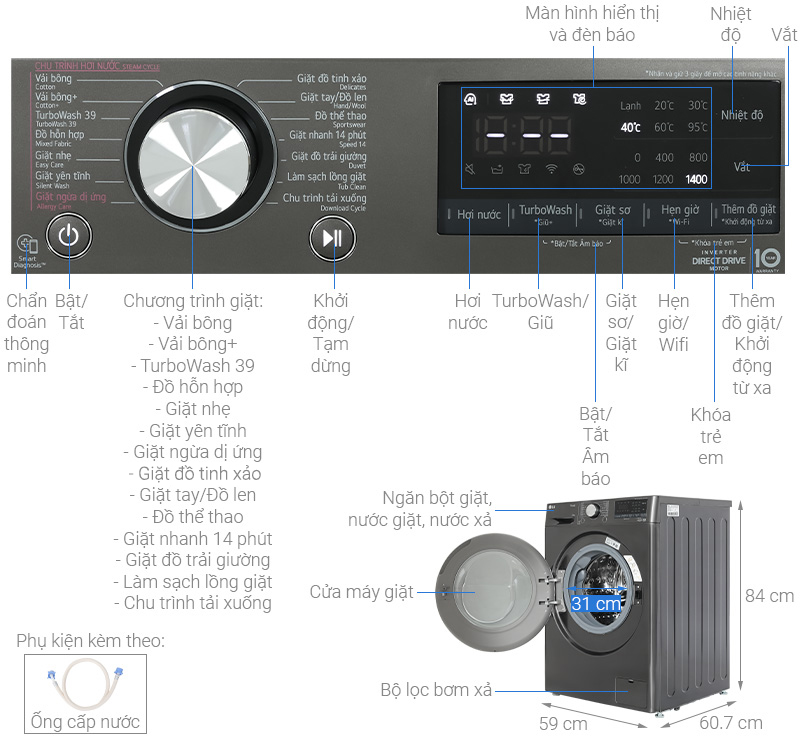 • Bảng điều khiển: Song ngữ Anh - Việt, có nút xoay, màn hình hiển thị