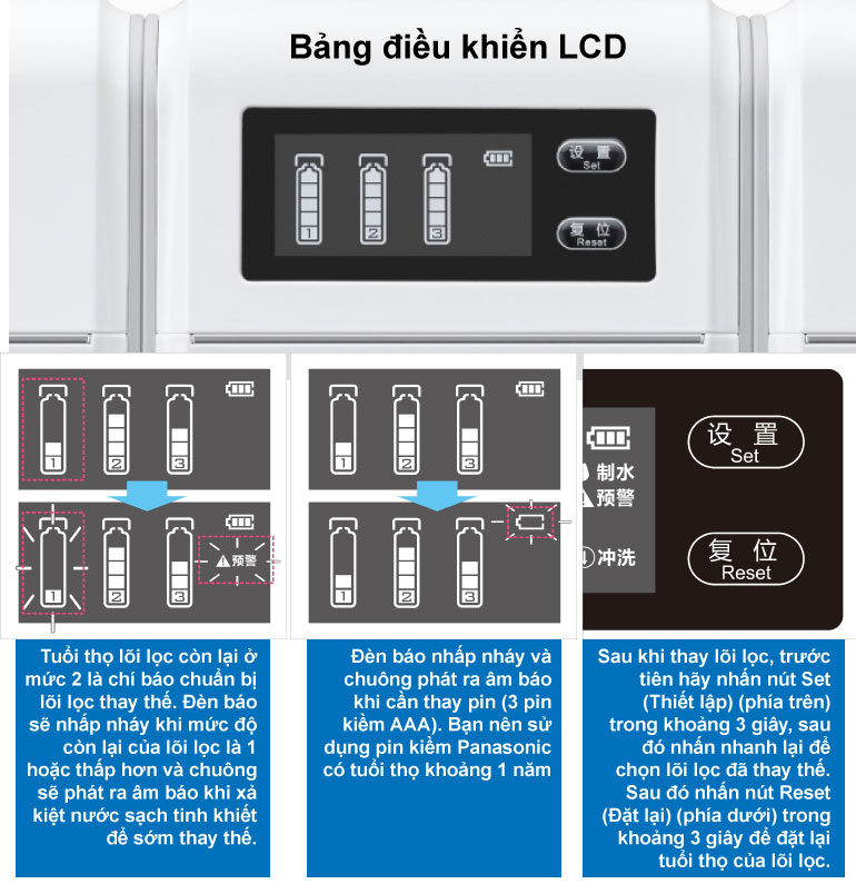 Có thể dễ dàng kiểm tra mức độ lõi lọc và mức pin còn lại trên màn hình LCD. Máy chạy bằng 3 pin kiềm AAA và bộ phận chính không phải bắt vít