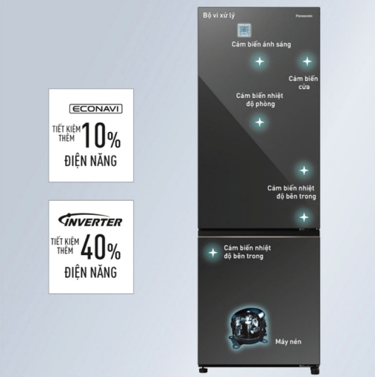 Ba loại cảm biến ECONAVI(Cảm biến mở cửa, cảm biến nhiệt độ phòng, cảm biến nhiệt độ bên trong) giúp giám sát mức độ sử dụng tủ lạnh hàng ngày, tiết kiệm 10% điện năng. Máy nén Inverter giúp tối ưu hóa hiệu suất làm lạnh, làm giảm 40% lượng điện năng tiêu thụ.
