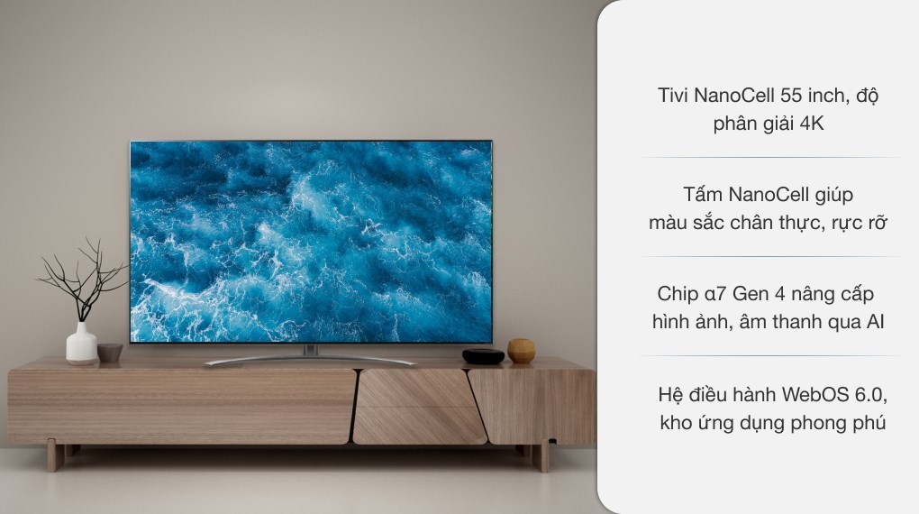 Tivi NanoCell sử dụng các hạt nano, công nghệ nano đặc biệt của riêng LG, giúp lọc, tinh chỉnh màu sắc, loại bỏ các tín hiệu gây nhiễu khỏi các bước sóng RGB. Đặc biệt, Tivi được thiết kế chân đỡ Gallery cho phép bạn đặt để mọi điểm, tô vẽ thêm không gian ngôi nhà bạn.