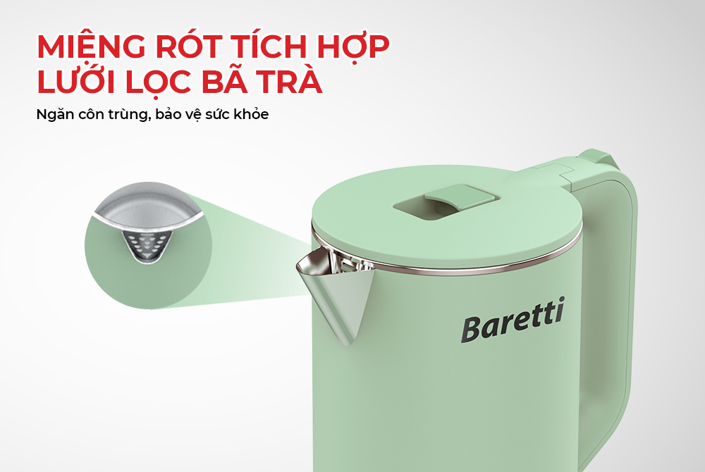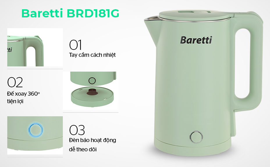 Ấm siêu tốc Baretti BRD181G có dung tích 1.8 lít, công suất lớn 1500W. Thiết kế với kiểu dáng, màu sắc xanh đẹp và bắt mắt sẽ là điểm nhấn nổi bật trong gian bếp nhà bạn.