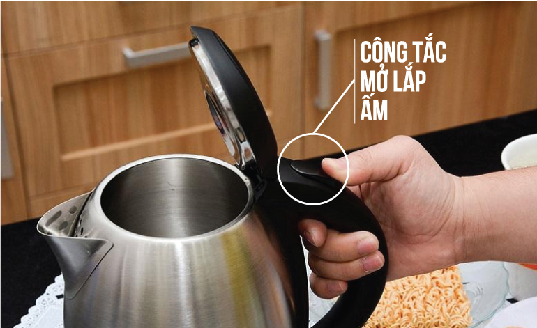 Nút mở nắp ấm được bố trí phía trên tay cầm mang đến sự tiện lợi khi sử dụng chỉ với 1 thao tác nhấn