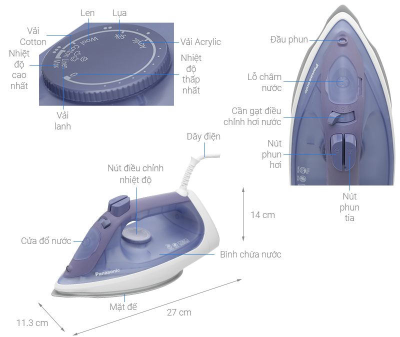 | Dây xoay 360° | Luồng hơi nước mạnh mẽ từ toàn bộ mặt đế với rãnh chữ U |