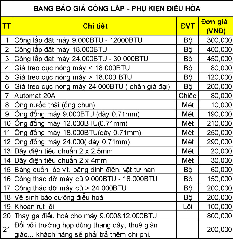 Bảng báo giá này được áp dụng trong năm 2022 dành cho khách hàng mua sản phẩm điều hòa tại Siêu thị điện máy Ánh Chinh. Đối với khách hàng không mua hàng tại Ánh Chinh nhưng cần bảo dưỡng điều hòa hoặc tháo dỡ máy cũ thì có thể liên hệ qua số 02273.847.847 - 0934.340.929