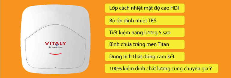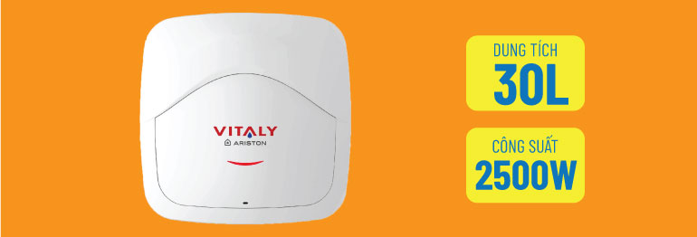 Bình tắm nóng lạnh Ariston VITALY 30 có dung tích 30 lít đáp ứng nhu cầu sử dụng từ 3-4 người. Ariston VITALY 30 với kiểu dáng hình vuông, màu trắng, chữ VITAVY màu đỏ ở chính giữa, Sản phẩm được làm nóng với tính năng cơ bản theo chuẩn chất lượng Ariston