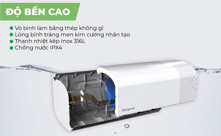 - Lòng bình tráng men kim cương nhân tạo siêu bền, hạn chế rò rỉ nước giúp thành bình không bị ăn mòn