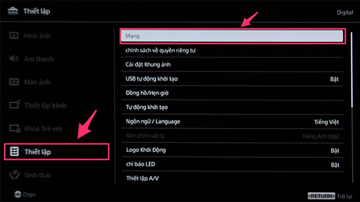 Bước 3. Trong phần Cài đặt hệ thống chọn Thiết lập - chọn Mạng.