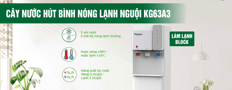 Máy làm nóng lạnh nước uống Kangaroo KG63A3 thiết kế âm bình gọn gàng, sang trọng phù hợp không gian của gia đình, văn phòng, nhà hàng, trung tâm thương mại… 3 vòi riêng biệt cùng 3 chế độ nóng – lạnh – thường tiện lợi phục vụ mọi nhu cầu giải khát và chế biến.