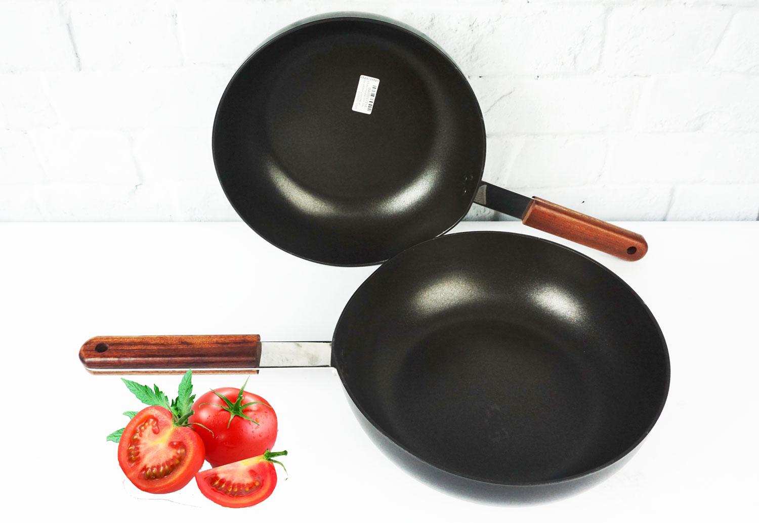Đáy phẳng, tay cầm bằng gỗ, có lỗ treo tiện dụng