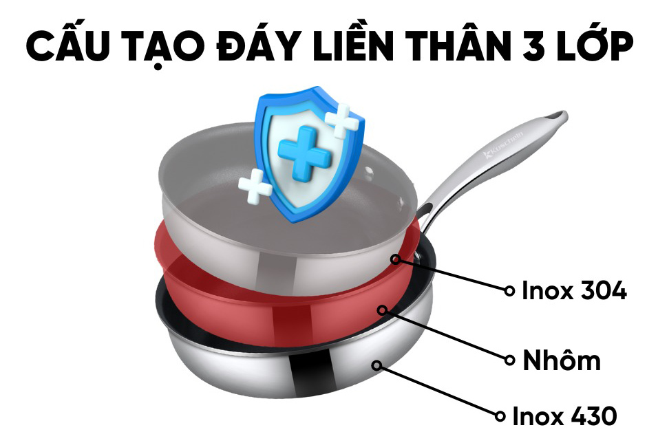 - Chảo inox KFP063S có cấu trúc 3 lớp LIỀN ĐÁY giúp truyền và giữ nhiệt tối ưu, tiết kiệm năng lượng.