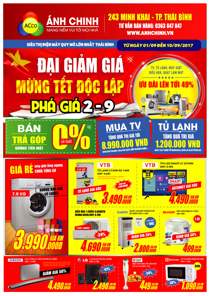 Tưng bừng Khuyến mại nhân ngày Quốc Khánh 2/9/2017 siêu thị điện máy Ánh Chinh tiếp tục chương trình khuyến mại với nhiều phần quà hấp dẫn (Click để xem)
