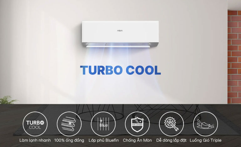 Khi kích hoạt chức năng “TURBO MODE” trên điều khiển thì máy điều hòa Aqua sẽ hoạt động ở chế độ đặc biệt được cài đặt với tần số cao, khi đó nhiệt độ trong phòng sẽ đạt đến nhiệt độ cài đặt nhanh nhất, nhanh hơn 47% so với máy điều hòa thông thường