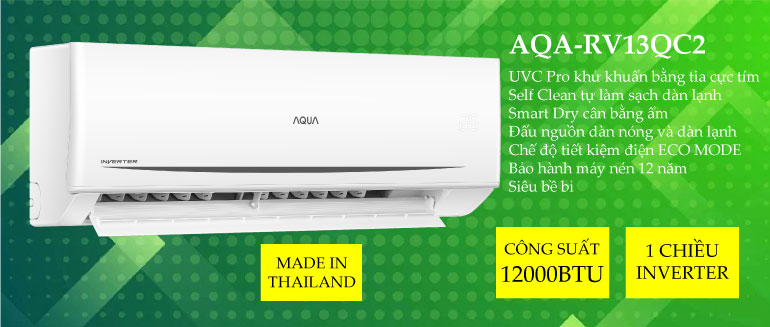 Điều hòa Aqua 1 chiều inverter 12.000Btu AQA-RV13QC2 là lựa chọn hoàn hảo cho những ai đang tìm kiếm một chiếc máy điều hòa tiết kiệm điện, làm lạnh nhanh, khử khuẩn hiệu quả và hoạt động êm ái.