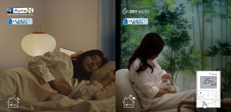 Chế độ iAUTO-X tích hợp cảm biến độ ẩm liên tục theo dõi và điều chỉnh độ ẩm tương đối xuống dưới 60% giúp tối ưu môi trường không khí trong nhà để bạn tận hưởng cảm giác mát lạnh dễ chịu suốt ngày dài.