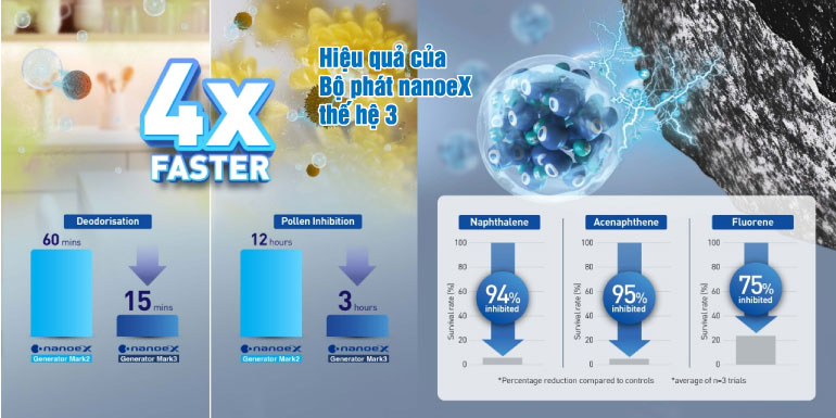 Được trang bị bộ phát nanoe X thế hệ 3 mới nhất mang lại hiệu quả cao hơn trong việc ức chế các chất ô nhiễm khác nhau và khử mùi hôi với tốc độ nhanh hơn 4 lần so với bộ phát nanoe X thế hệ 2 trước đây.