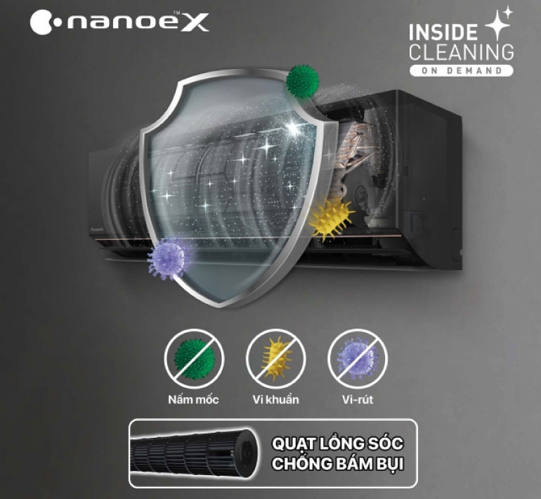 Chức năng vệ sinh bên trong dàn lạnh giúp loại bỏ độ ẩm và giải phóng các hạt nanoe™ X, ức chế các chất gây ô nhiễm khác nhau trong khi vẫn đảm bảo bên trong dàn lạnh luôn khô ráo và sạch sẽ. Kích hoạt chức năng một cách dễ dàng bằng cách bấm và giữ nút nanoe trên điều khiển. Quạt lồng sóc được phủ lớp đặc biệt ngăn ngừa bụi bám dính đảm bảo luôn sạch sẽ.