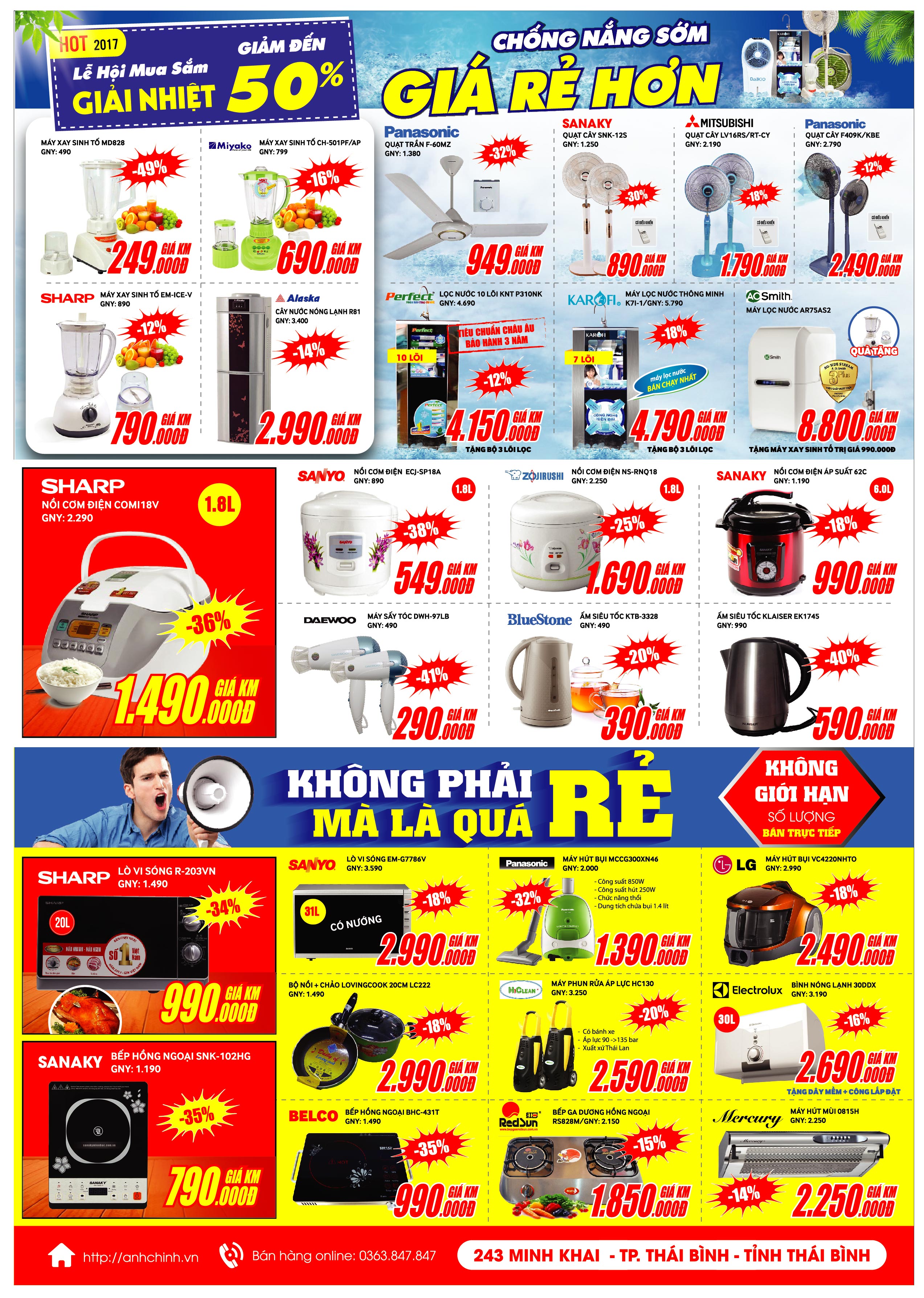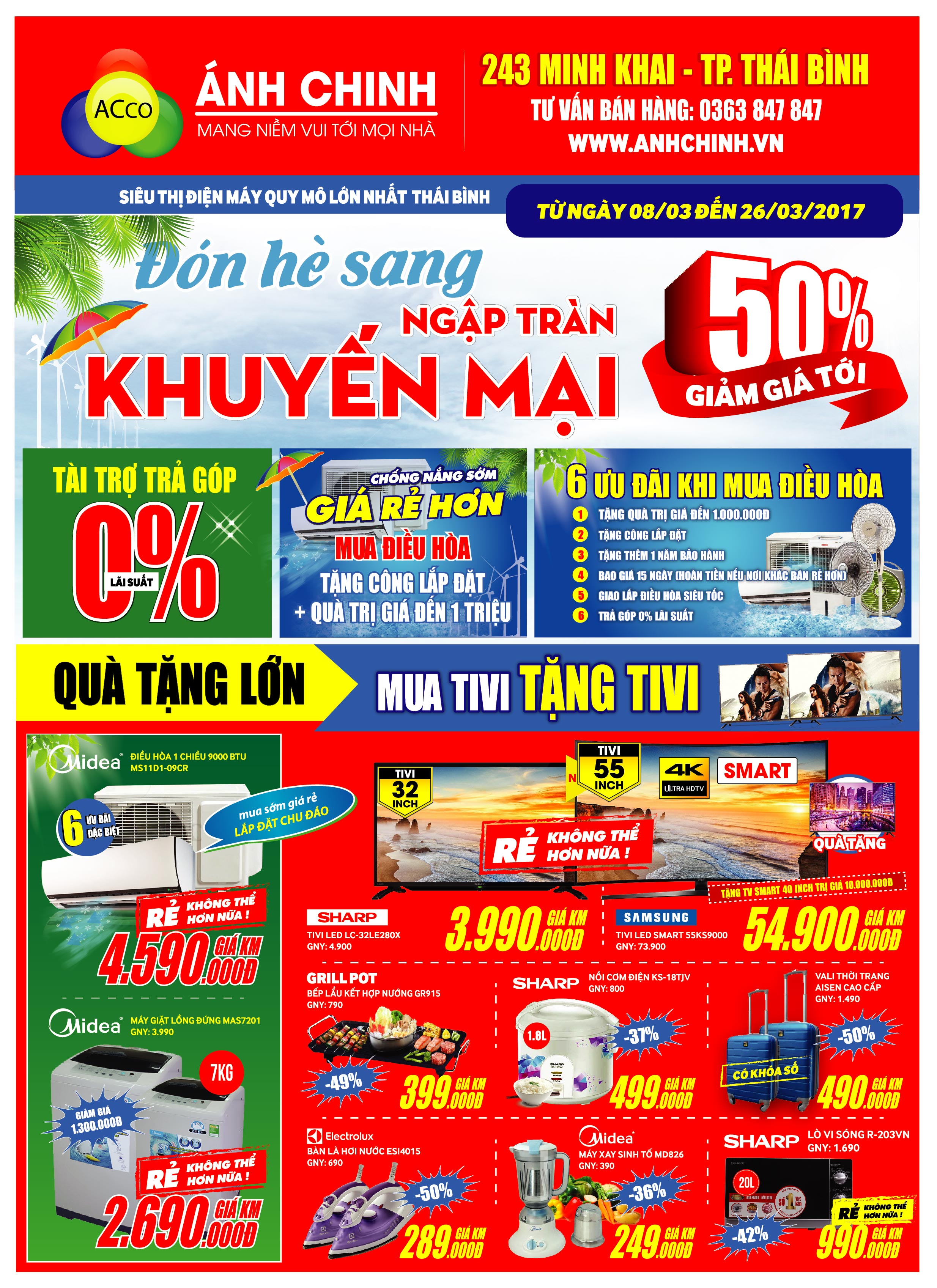 Từ 08/03 đến 26/03 năm 2017 Ánh Chinh tiếp tục chương trình khuyến mại ĐÓN HÈ SANG NGẬP TRÀN KHUYẾN MẠI. Hàng loạt các sản phẩm ti vi, tủ lạnh, máy giặt và thiết bị nhà bếp giảm giá đến 50%. Ti vi 32 inch giá chỉ từ 3.390.000.