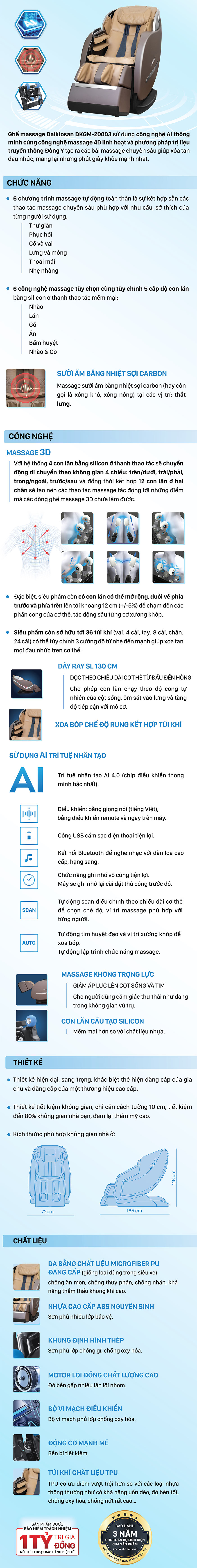 Ghế massage toàn thân Daikiosan DKGM-20003 sử dụng trí tuệ nhân tạo AI thông minh cùng công ghệ Massage 4D linh hoạt và phương pháp trị liệu Đông y truyền thống tạo ra những bài Massage giúp xóa tan mệt mỏi, đau nhức vai gáy, lưng, đùi, tay, chân. Daikiosan DKGM-20003 có giá thành rẻ, máy có thể sử dụng cho gia đình, bệnh viện.....
