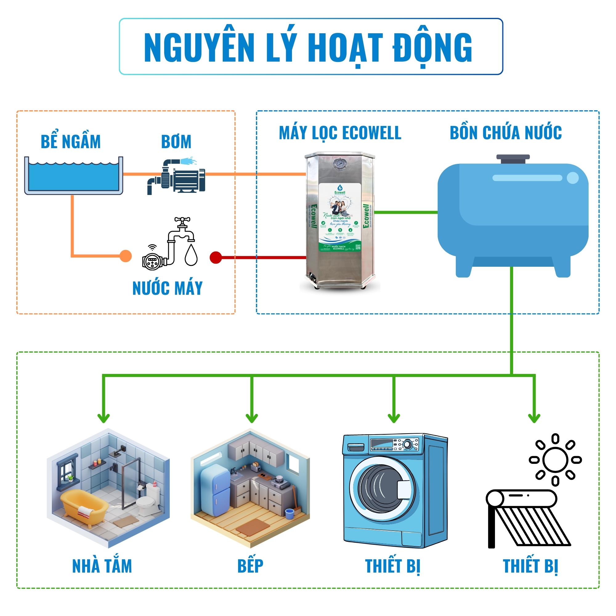Máy lọc tổng Ecowell là hệ thống lọc tổng đầu nguồn "Dành cho nước máy", thiết kế chuyên biệt cho các căn hộ chung cư, nhà phố, nhà tư nhân, giúp loại bỏ clo dư, kim loại nặng, vi khuẩn, tạp chất và mùi hôi… trước khi nước đi vào hệ thống đường ống từng căn hộ. Bạn có thể an tâm sử dụng nước cho sinh hoạt hàng ngày – từ tắm giặt, nấu ăn, đến tưới tiêu. Máy lọc Ecowell hiện tại chỉ sử dụng cho nước máy, không dùng khi nước đầu vào là nước giếng khoan, nước ao hồ, sông suối.