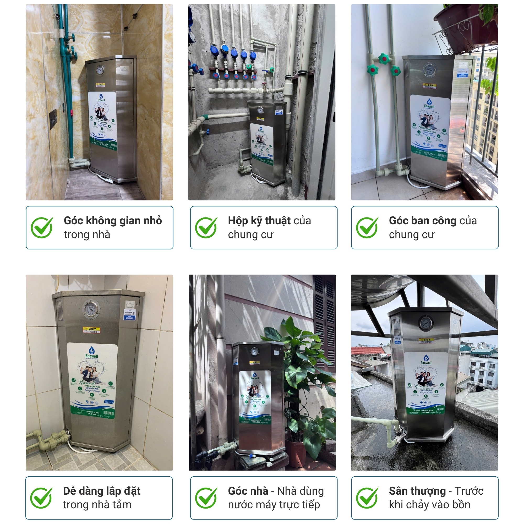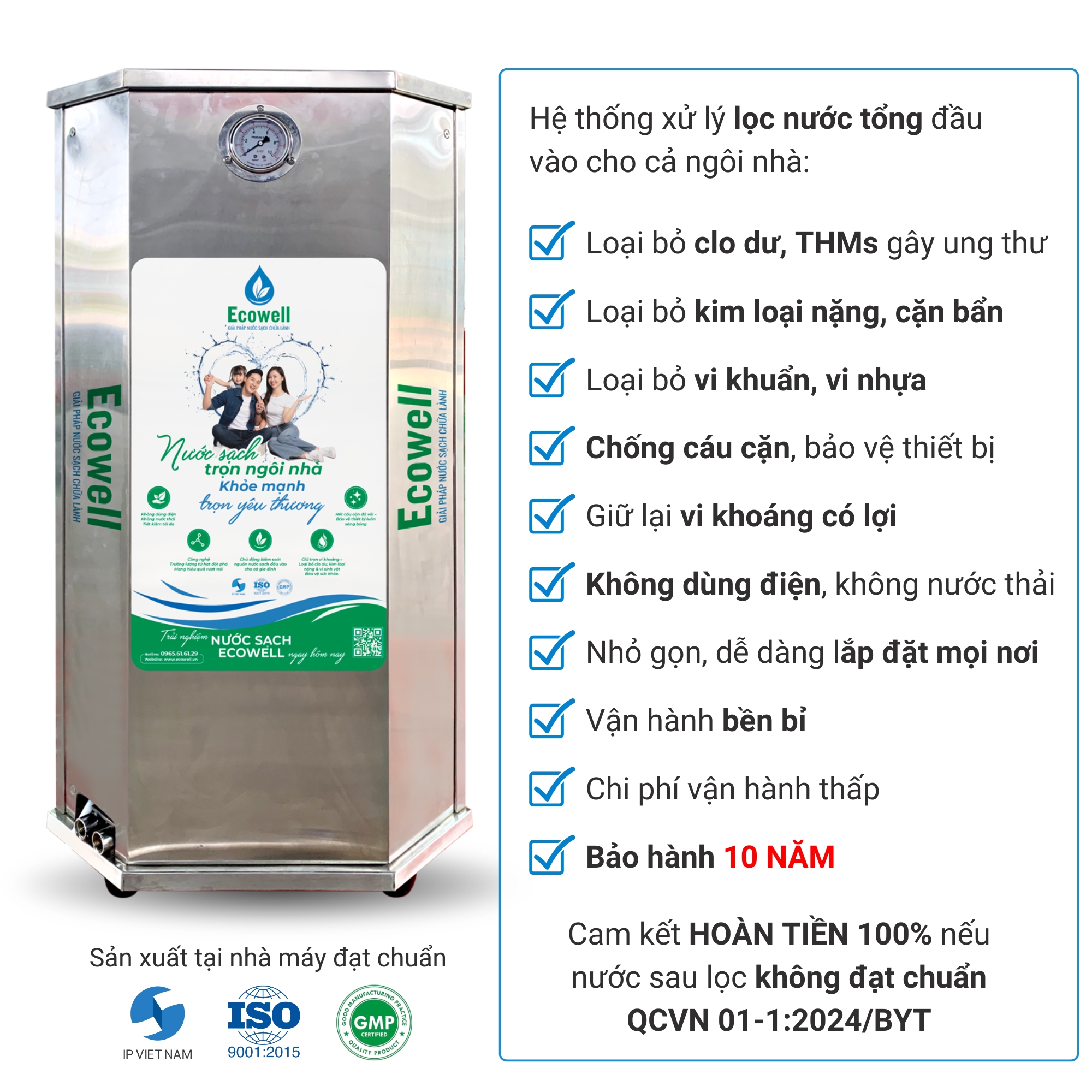 Máy lọc tổng Ecowell là hệ thống lọc tổng đầu nguồn "Dành cho nước máy", thiết kế chuyên biệt cho các căn hộ chung cư, nhà phố, nhà tư nhân, giúp loại bỏ clo dư, kim loại nặng, vi khuẩn, tạp chất và mùi hôi… trước khi nước đi vào hệ thống đường ống từng căn hộ. Bạn có thể an tâm sử dụng nước cho sinh hoạt hàng ngày – từ tắm giặt, nấu ăn, đến tưới tiêu. Máy lọc Ecowell hiện tại chỉ sử dụng cho nước máy, không dùng khi nước đầu vào là nước giếng khoan, nước ao hồ, sông suối.