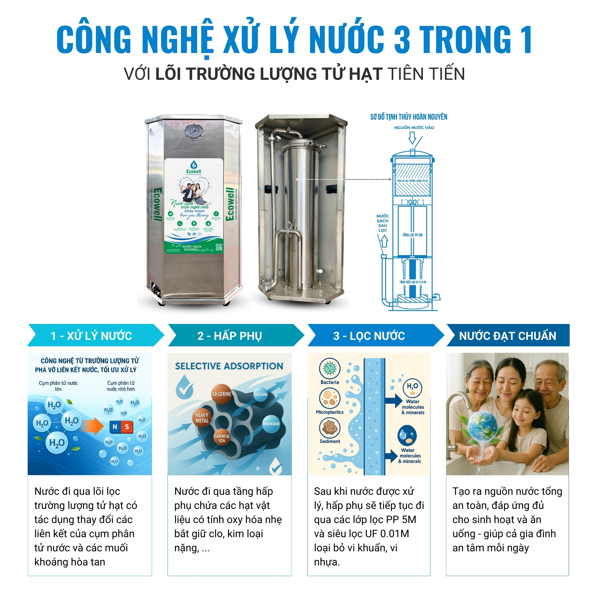 Công nghệ tiên tiến kết hợp với giải pháp khác biệt giúp Ecowell loại bỏ kim loại nặng, vi khuẩn, tạp chất, ... ở cấp độ phân tử.