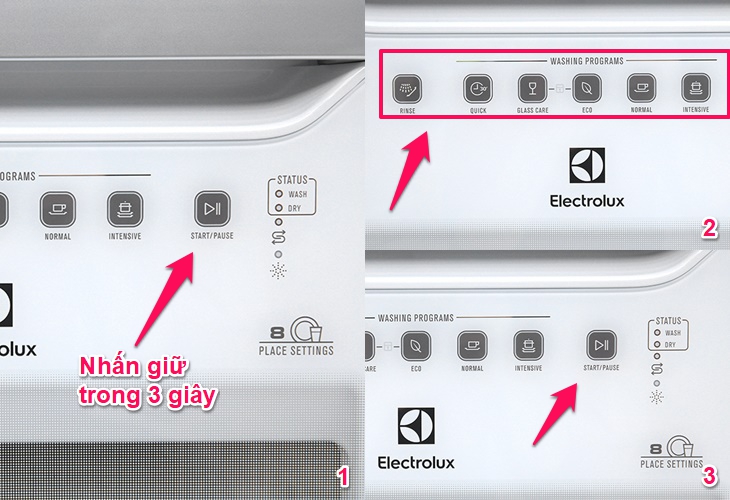 4 – Khóa trẻ em: Nhấn đồng thời 2 nút GLASS CARE và ECO sẽ kích hoạt chức năng khóa trẻ em, đèn báo chức năng khóa ở giữa 2 nút này sẽ phát sáng.