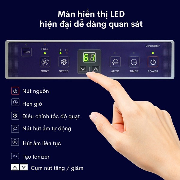 | Cài đặt độ ẩm | Tích hợp lọc Ionizer trong quá trình hút ẩm |