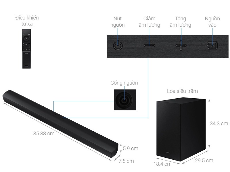 | Kích thước loa thanh | Ngang 85.88 cm - Sâu 7.5 cm - Cao 5.9 cm |