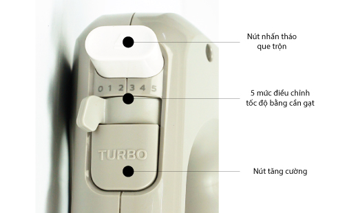 Bộ phận điều khiển được bố trí phía trên với 5 mức điều chỉnh tốc độ bằng cần gạt theo nhu cầu sử dụng với 1 nút Turbo tăng cường