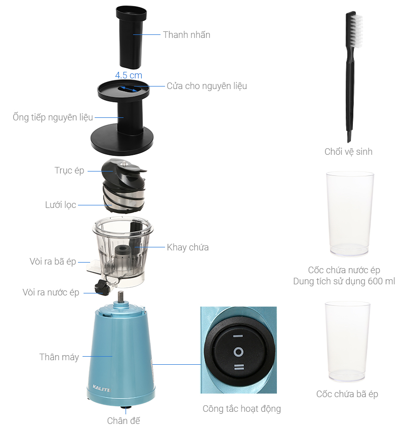 Ép chậm Kalite này được trang bị công suất lớn 200w nhưng vẫn êm ái, không gây tiếng ồn