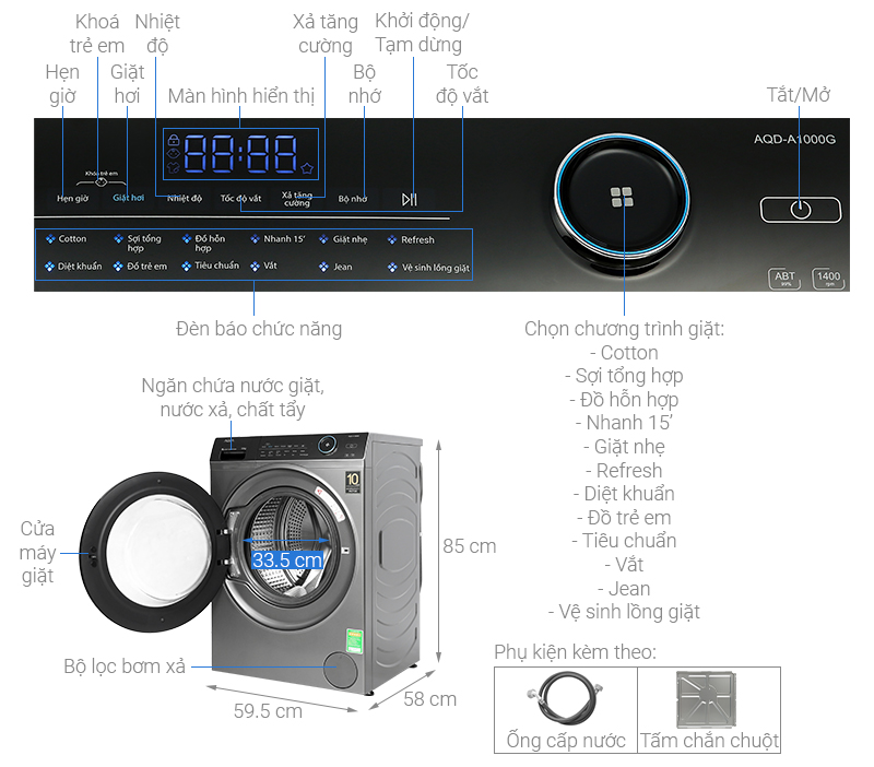 Máy giặt lồng ngang Aqua AQD-A1000G.S có khối lượng giặt 10kg cho khả năng giặt giũ lớn, có thiết kế thời trang, hiện đại mang để vẻ sang trọng cho không gian sống. AQD-A1000G.S được ra mắt vào năm 2021 sử dụng trí tuệ nhân tạo AI cho khả năng giặt sạch quần áo hơn