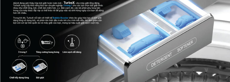 TurboX mang đến khả năng hòa tan 3 trong 1 cho các loại bột giặt khác nhau như chất lỏng, bột..... và hòa tan thật đều trước khi chu trình được bắt đầu mang đến khả năng giặt sạch hoàn hảo mà không sợ cặn bột giặt bám trên quần áo. Hộp TurboX có thể tháo rời để thuận tiện cho việc vệ sinh.