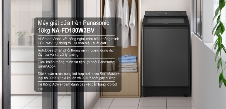 Máy giặt cửa trên Panasonic NA-FD180W3BV là sự lựa chọn hoàn hảo cho gia đình có nhu cầu giặt lớn, với khối lượng giặt lên đến 18kg. Sản phẩm được thiết kế hiện đại, tích hợp nhiều công nghệ tiên tiến giúp tiết kiệm thời gian, nước và năng lượng, đồng thời đảm bảo quần áo luôn được giặt sạch và bảo vệ tối ưu.