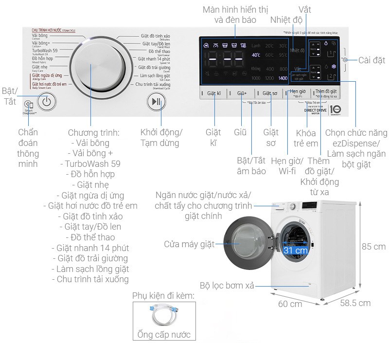 | Bảng điều khiển | Anh - Việt có núm xoay, nút nhấn, cảm ứng, màn hình hiển thị |