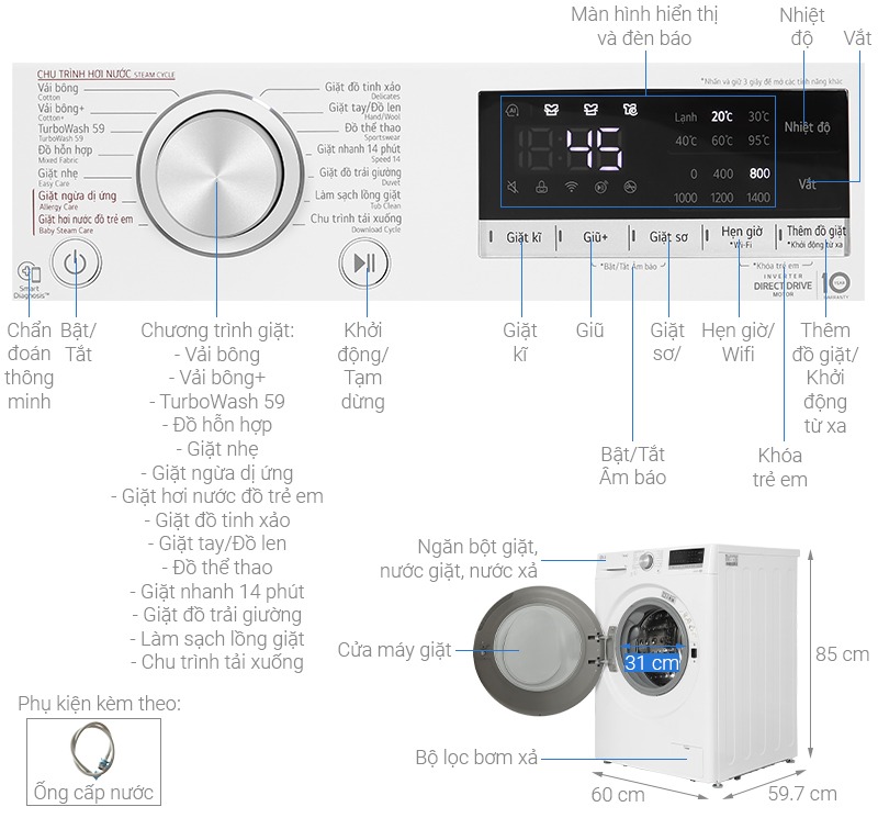 Máy giặt lồng ngang LG FV1410S4W1 là một sản phẩm tiên tiến với khả năng giặt lớn, hiệu suất cao và nhiều tính năng tiện ích, đáp ứng mọi nhu cầu giặt đồ của gia đình bạn. Với khối lượng giặt lên đến 10kg, nó không chỉ đảm bảo giặt sạch mọi loại quần áo mà còn giúp tiết kiệm thời gian và công sức.
