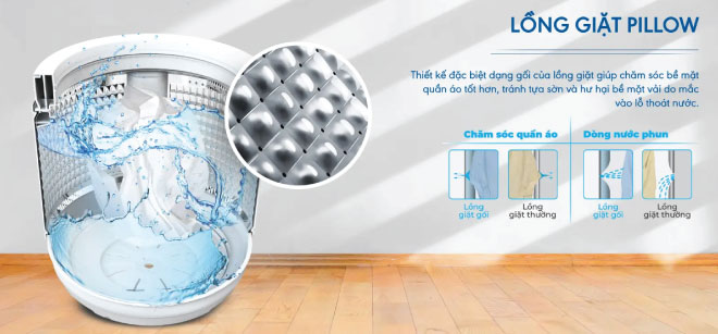 Lồng giặt được thiết kế dạng gối PILLOW giúp cho quần áo không bị sờn rách, bảo vệ bề mạt quần áo được tốt hơn