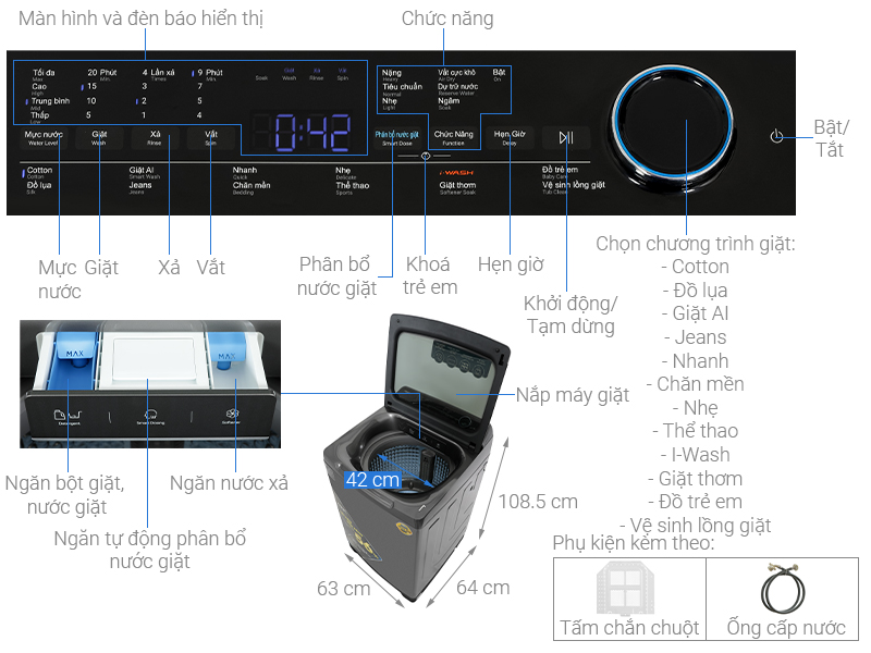 | Kích thước/Khối lượng giặt | 640 x 662 x 1016mm/16Kg |