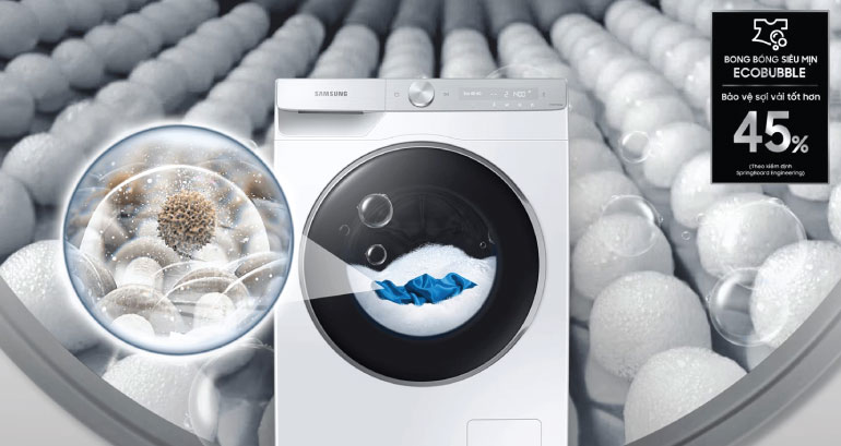 Với bong bóng siêu mịn Eco Bubble nước giặt/bột giặt sẽ được kích hoạt tạo thành bong bóng siêu mịn thẩm thấu vào từng sợi vải nhanh hơn gấp 40 lần so với máy giặt thông thường giúp đánh bay vế bẩn cứng đầu và bảo vệ quần áo tốt hơn đến 45%, tránh phai màu.