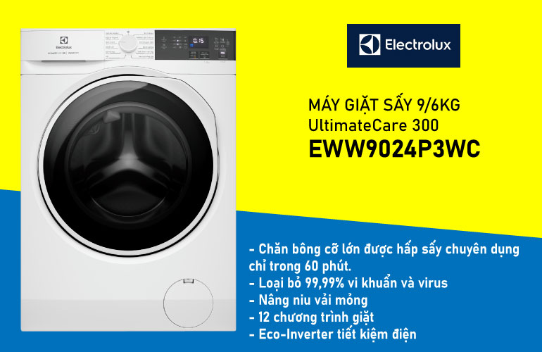 Máy giặt sấy Electrolux EWW9024P3WC là sự kết hợp hoàn hảo giữa thiết kế hiện đại, hiệu năng vượt trội và tính năng tiện ích, đáp ứng nhu cầu giặt giũ của các gia đình hiện đại. Với khả năng giặt lên đến 9kg và sấy 6kg, sản phẩm phù hợp với những hộ gia đình có từ 4-5 thành viên, giúp bạn dễ dàng xử lý lượng lớn quần áo trong một lần giặt.