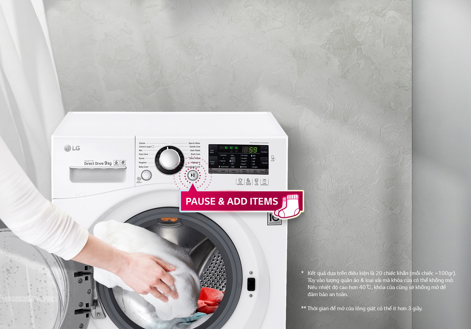Nếu bạn quên không bỏ đủ đồ giặt trong khi máy đã vận hành, chỉ cần nhấn nút "Pause" và thêm đồ giặt mà bạn mong muốn, từ đôi tất hay áo khoác,tất cả đều có thể. Chu trình Cotton, Đồ hỗn hợp, Giặt nhẹ nhàng, Giặt 14 phút v.v..., bất cứ chu trình nào bạn chọn, cửa đều có thể mở được ngay lập tức (khoảng 3 giây)** trong khi giặt.