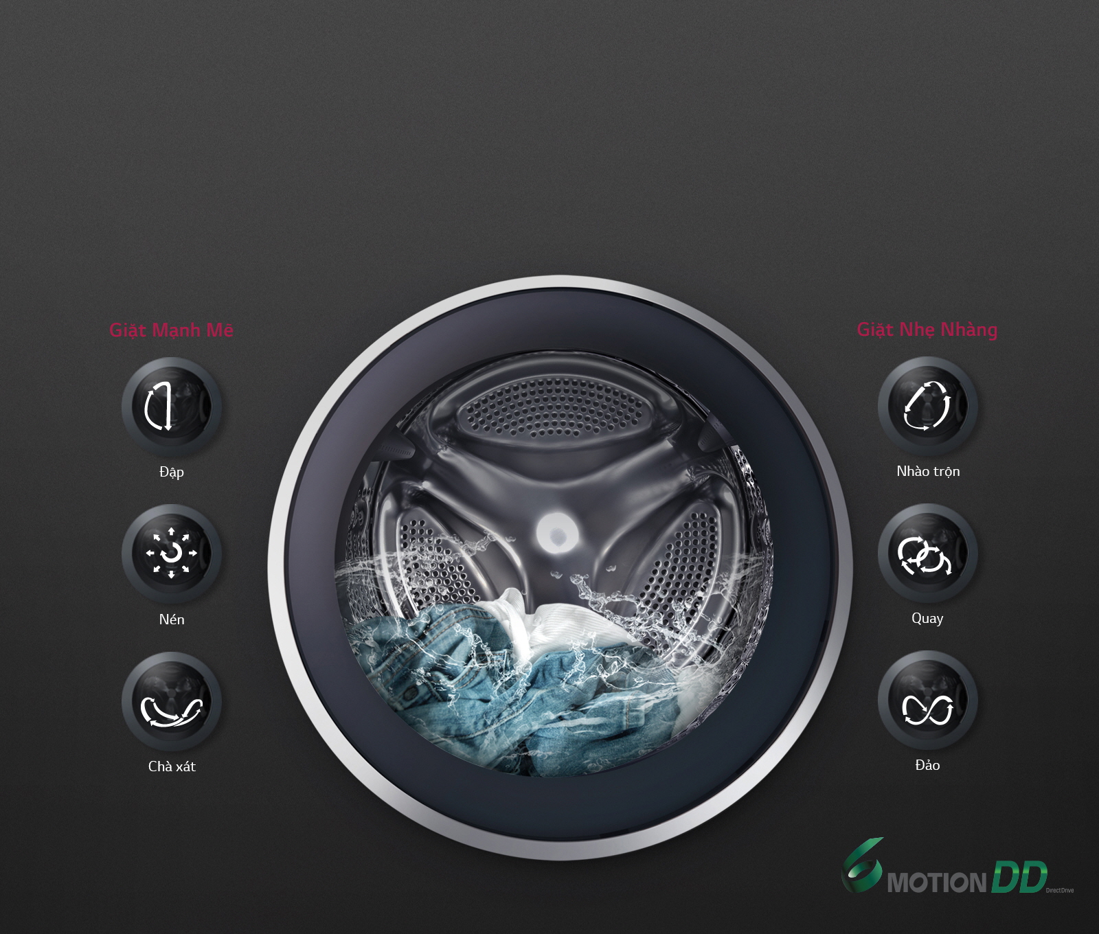 Trong chu trình giặt, 6 Chuyển động giặt 6motionDD sẽ chuyển động lồng giặt theo các hướng khác nhau để đem lại hiệu quả giặt tối ưu, cho phép bạn giặt thật sạch mà vẫn chăm sóc nhẹ nhàng áo quần