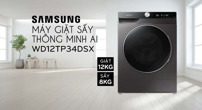 Với bảng điều khiển thông minh AI trên máy giặt Samsung WD12TP34DSX có nhiều tiện ích nổi bật như tự động ghi nhớ, đề suất, phân tích chế độ giặt và cài đặt yêu thích dựa vào thói quen sử dụng mà không cần phải tùy chỉnh sau mỗi lần giặt. Bảng điều khiển dễ dàng sử dụng với quy trình hướng dẫn thông minh và kết nối với điện thoại thông minh qua ứng dụng SmartThings do đó bạn hoàn toàn có thể điều khiển máy giặt ở bất kì đâu