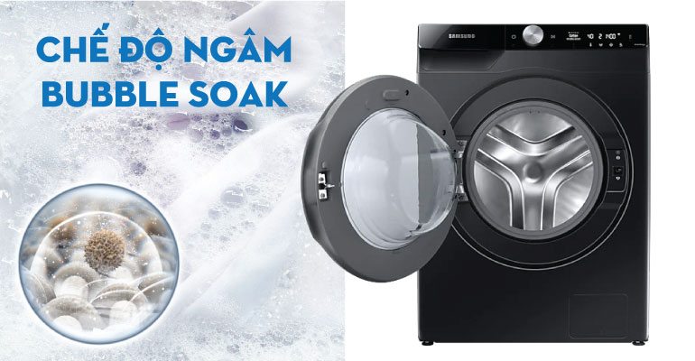 Khi quần áo bị các chất bẩn khó tẩy rửa dính vào như: Bùn đất, thức ăn, dầu mỡ..... trước khi cho vào máy giặt chúng ta phải giặt sơ qua một lượt. Với chế độ ngâm Bubble Soak trên máy giặt thông minh AI này sẽ giúp bạn làm những việc đó, Bubble Soak tăng thời gian ngâm, giúp bong bóng thẩm thấu sâu hơn vào quần áo, loại bỏ tất cả những vết bẩn cứng đầu.
