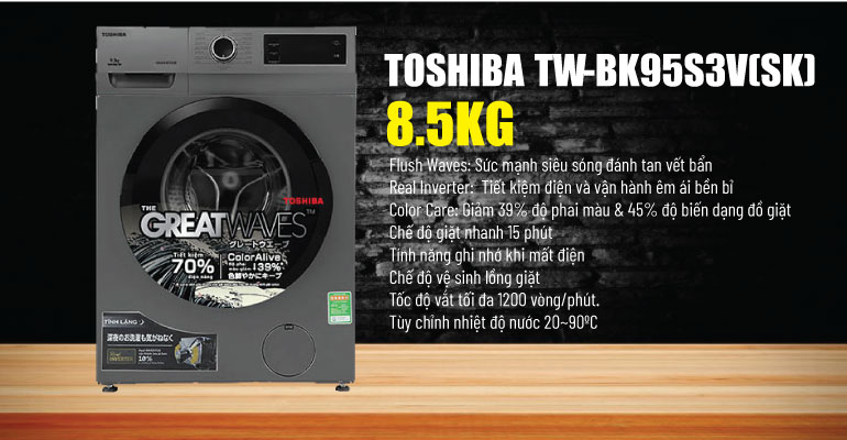 Máy giặt Toshiba TW-BK95S3V(SK) được thiết kế với màu xám, bảng điều khiển bằng nút vặn có màn hình hiển thị thời gian giặt. Khối lượng giặt 8.5kg có thể đáp ứng được nhu cầu sử dụng của 3-4 người, thiết kế lồng ngang cho khả năng giặt sạch hơn