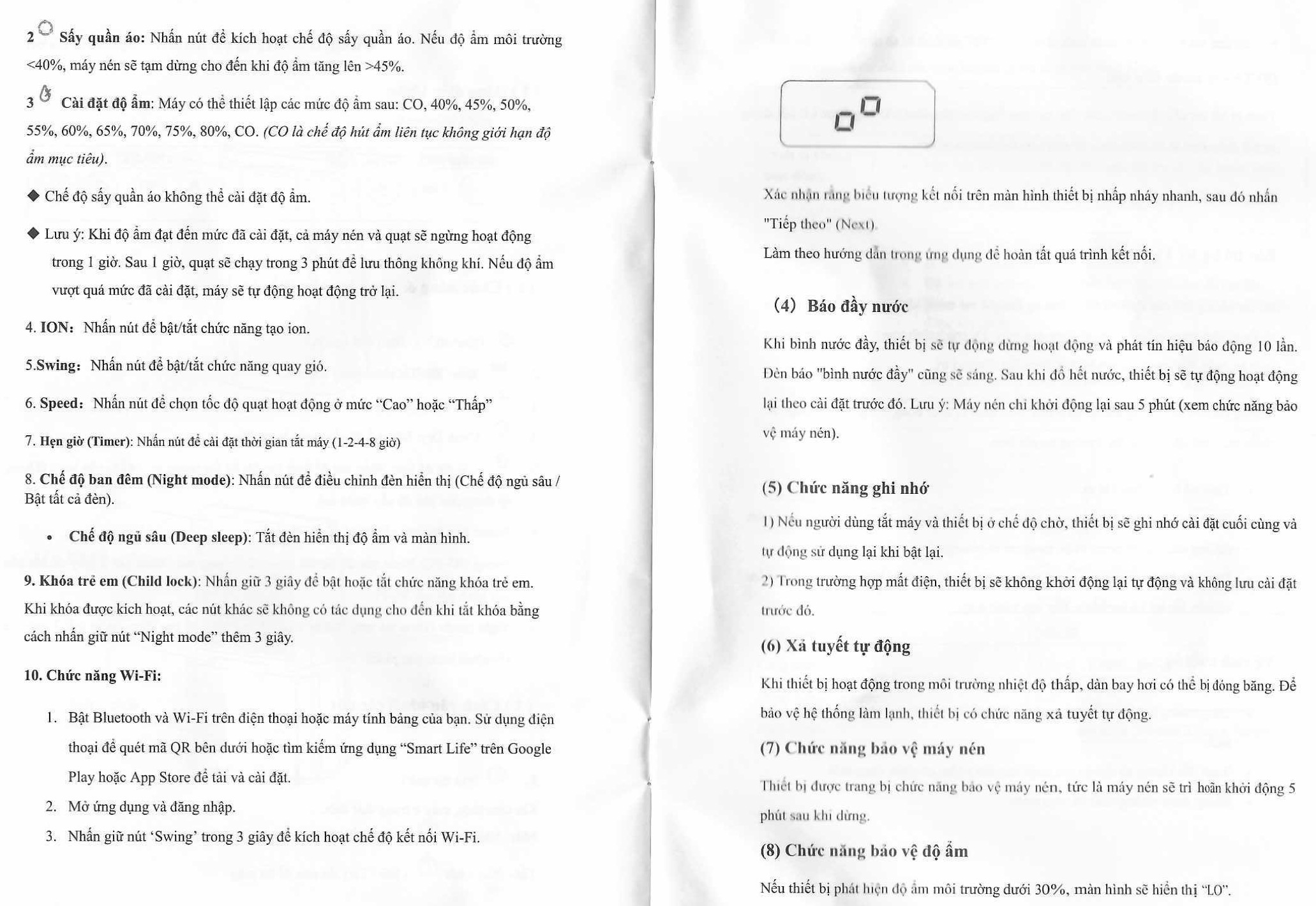 | Chức năng Ion hóa | Bảo vệ độ ẩm khi độ ẩm môi trường dưới 30%. màn hình sẽ hiển thị "LO" |
