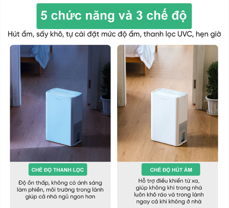 Máy hút ẩm Lumias D3 Pro là sản phẩm tiên tiến, trang bị gồm 5 chức năng thông minh bao gồm hút ẩm, sấy khô, tự cài đặt mức độ ẩm, thanh lọc UVC và hẹn giờ, đáp ứng mọi nhu cầu của người dùng. Đặc biệt, 3 chế độ sấy tùy chọn giúp bạn bảo vệ quần áo, đồ dùng một cách tốt nhất, tránh tình trạng ẩm mốc, mùi hôi hay vi khuẩn tích tụ trên bề mặt.