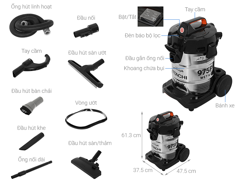 | Các loại đầu hút | Đầu hút chổi, Đầu hút khe, Đầu hút bàn chải, Đầu hút sàn/thảm |