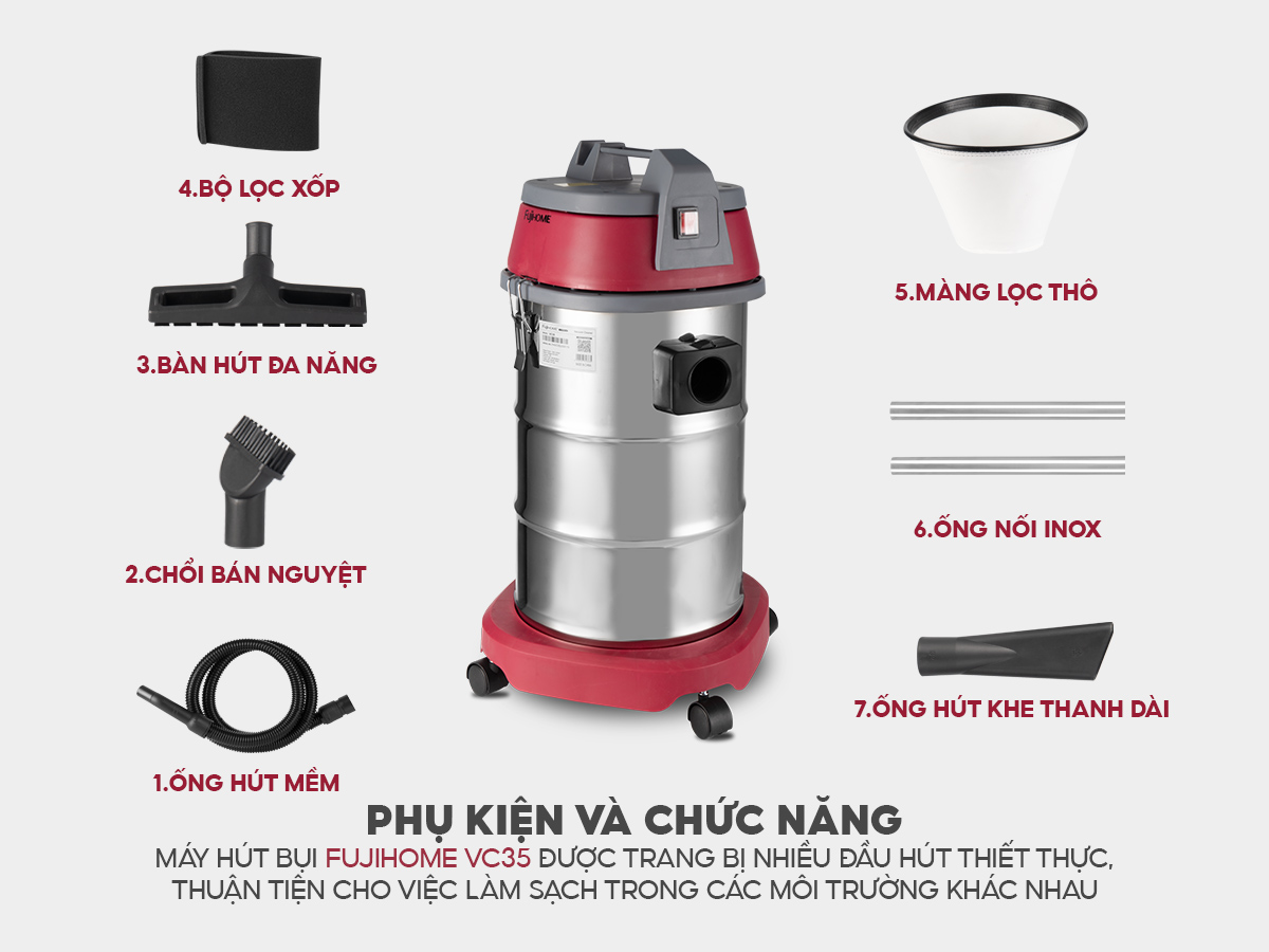 | Các loại đầu hút | Đầu hút khe, Đầu hút bàn chải, Đầu hút sàn/thảm |