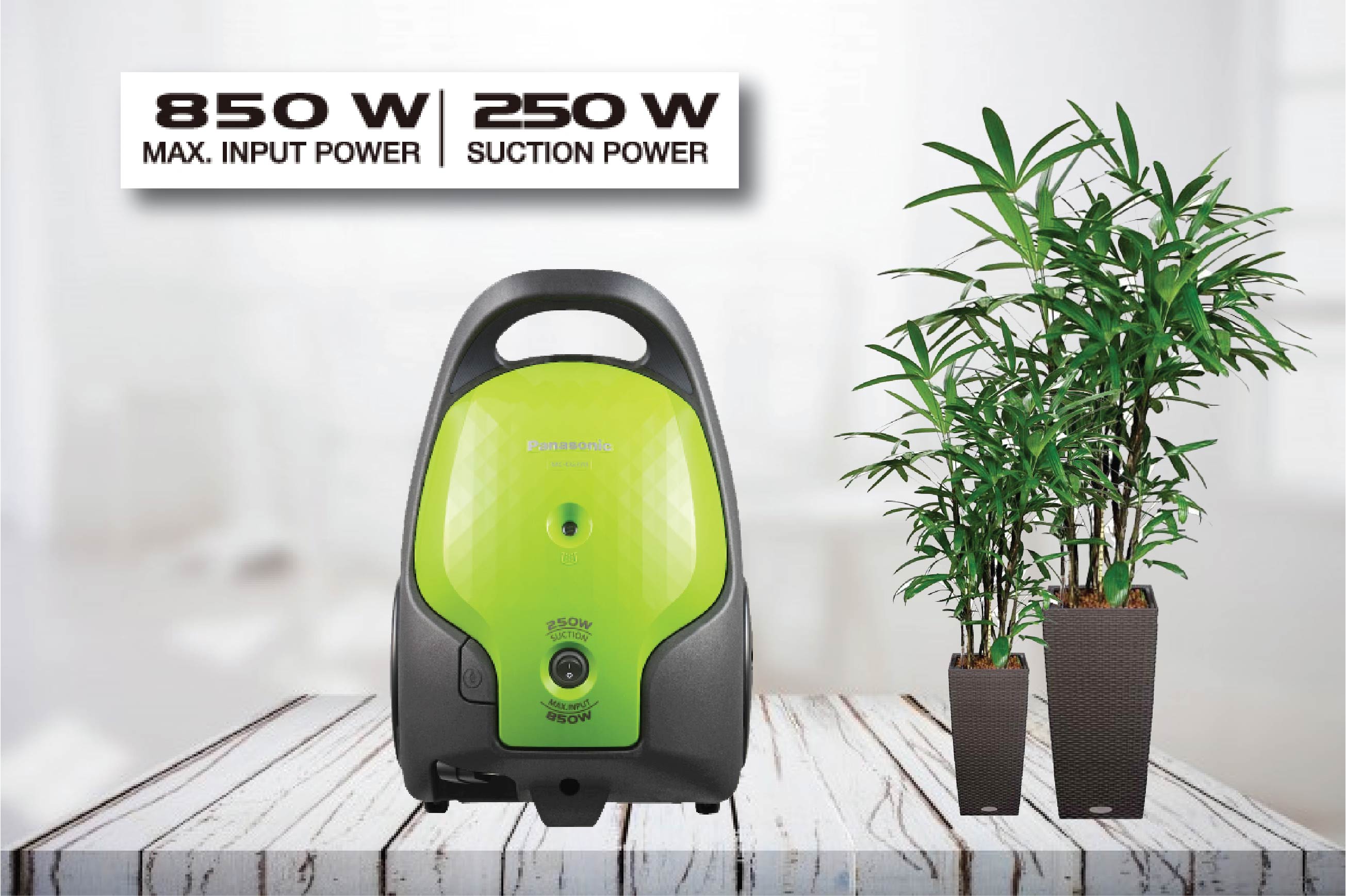 Công suất đầu vào 850W và công suất hút 250W, tạo lực hút mạnh mẽ giúp hút nhanh, hút sạch và tiết kiệm điện.